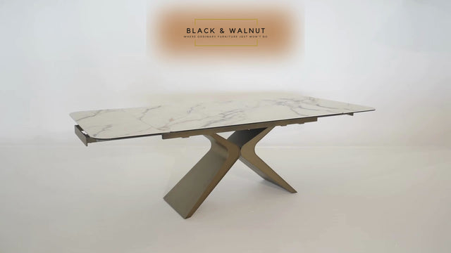 Crafted with a sophisticated composite top of sintered stone and tempered glass in a matte Royal Patina finish, the table exudes luxury while promising durability. The fully welded X-shaped base in glittered bronze steel adds a striking touch to its sleek design.